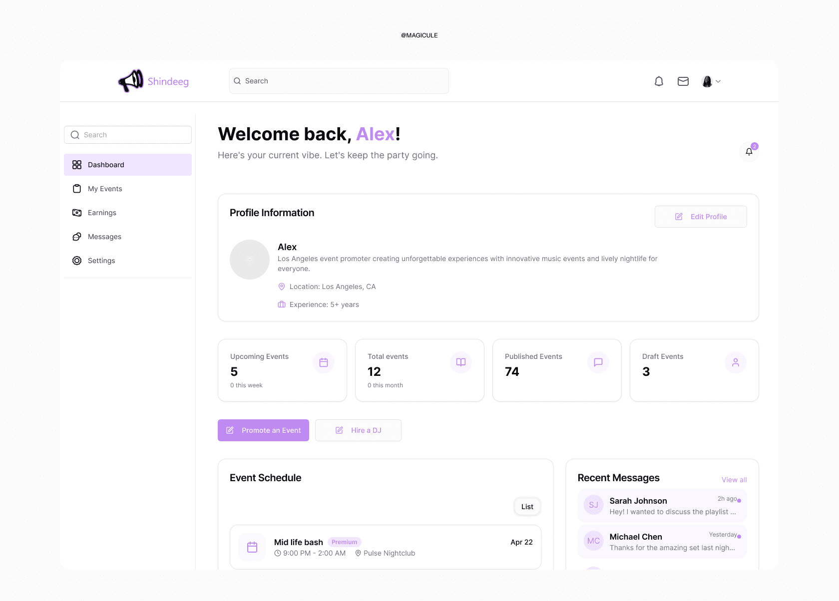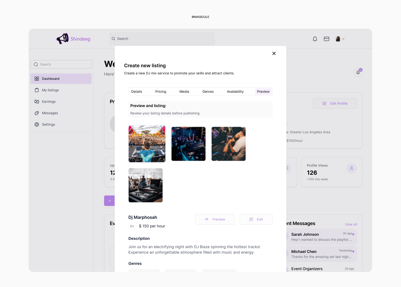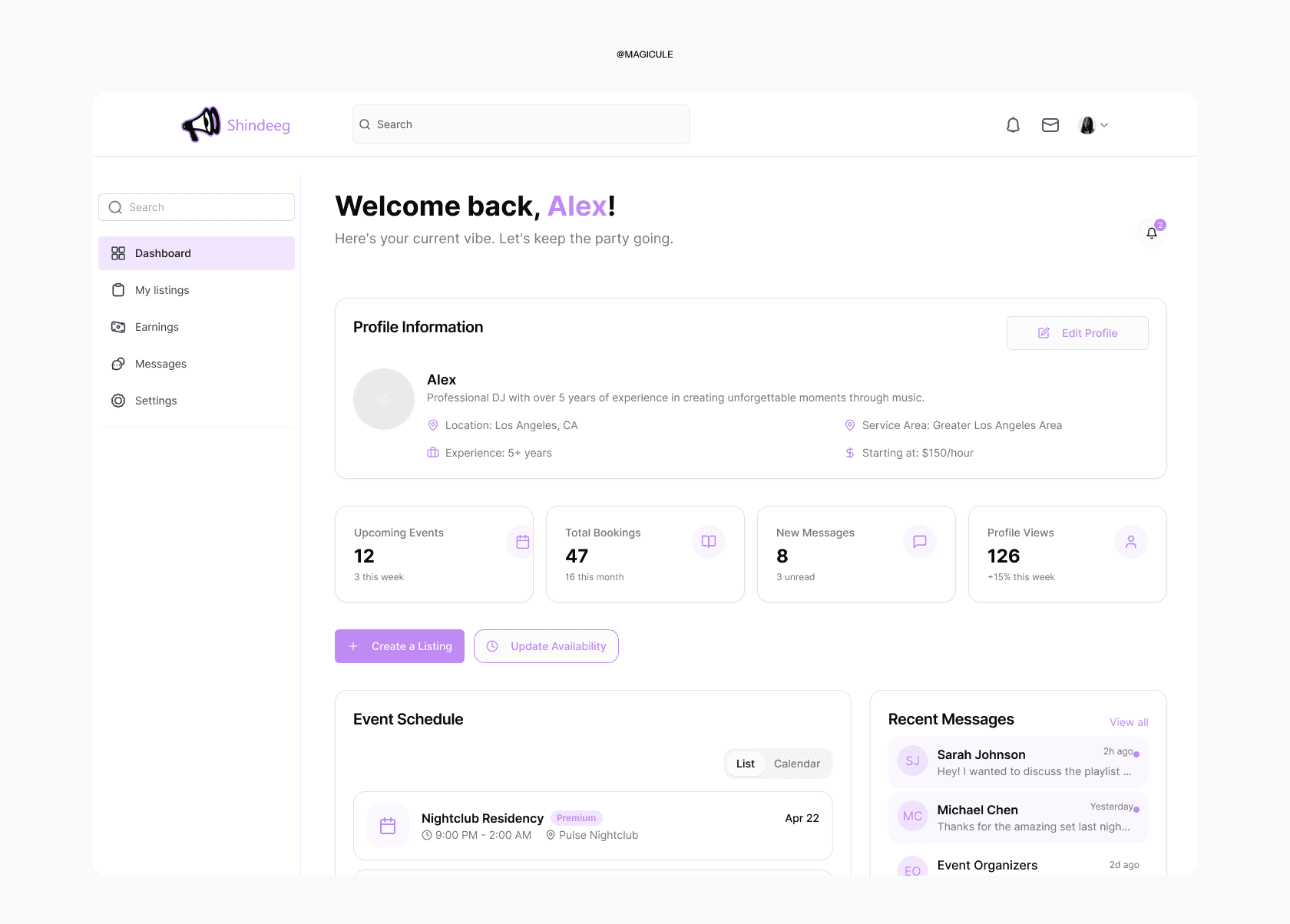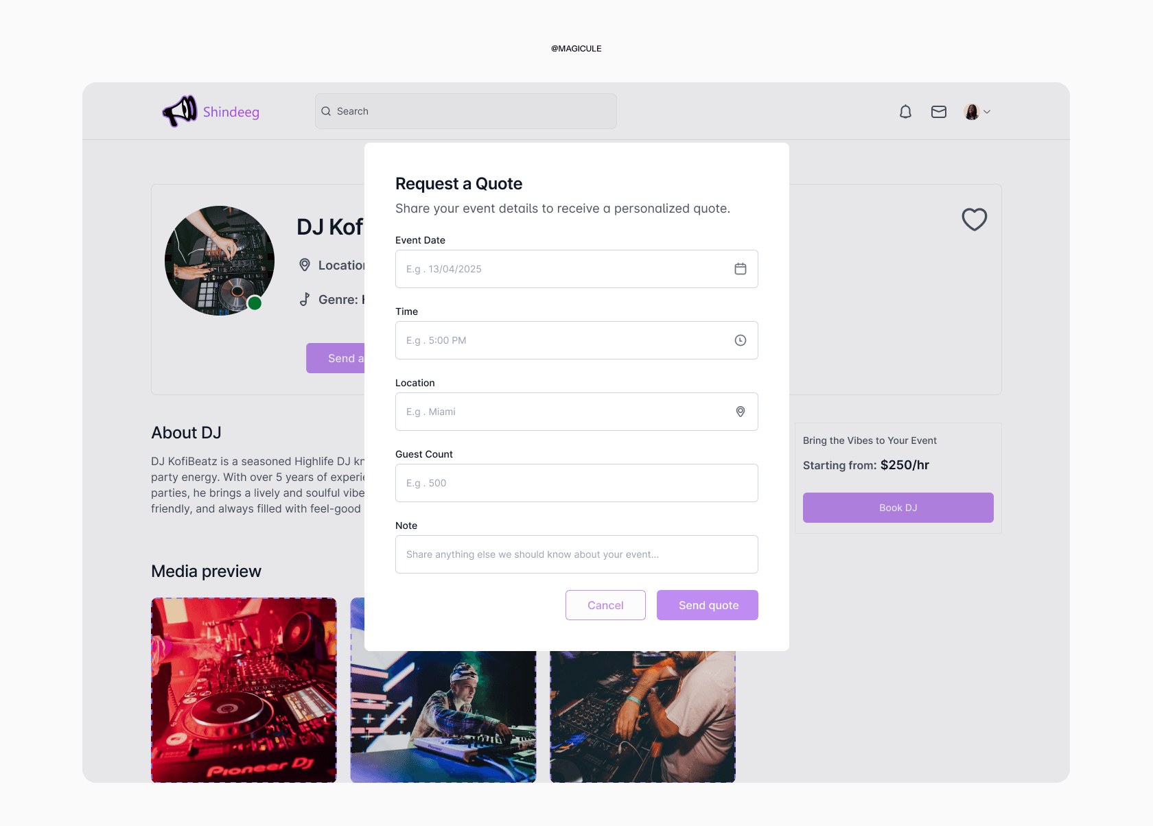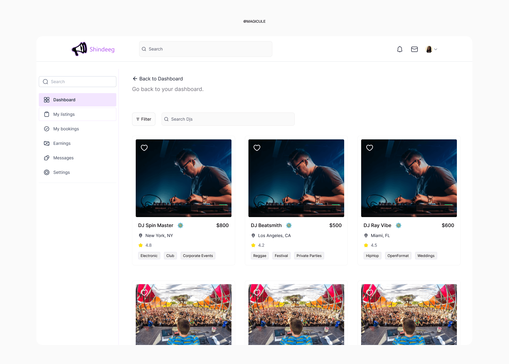 Shindeeg is a specialized marketplace designed to connect the key players in the live events and entertainment sector: DJs (Service Providers), Event Promoters (Venue/Event Organizers), and Party Goers and also people who wants to hire Djs (Customers). The platform's goal is to simplify the discovery, booking, and management of live music and events.