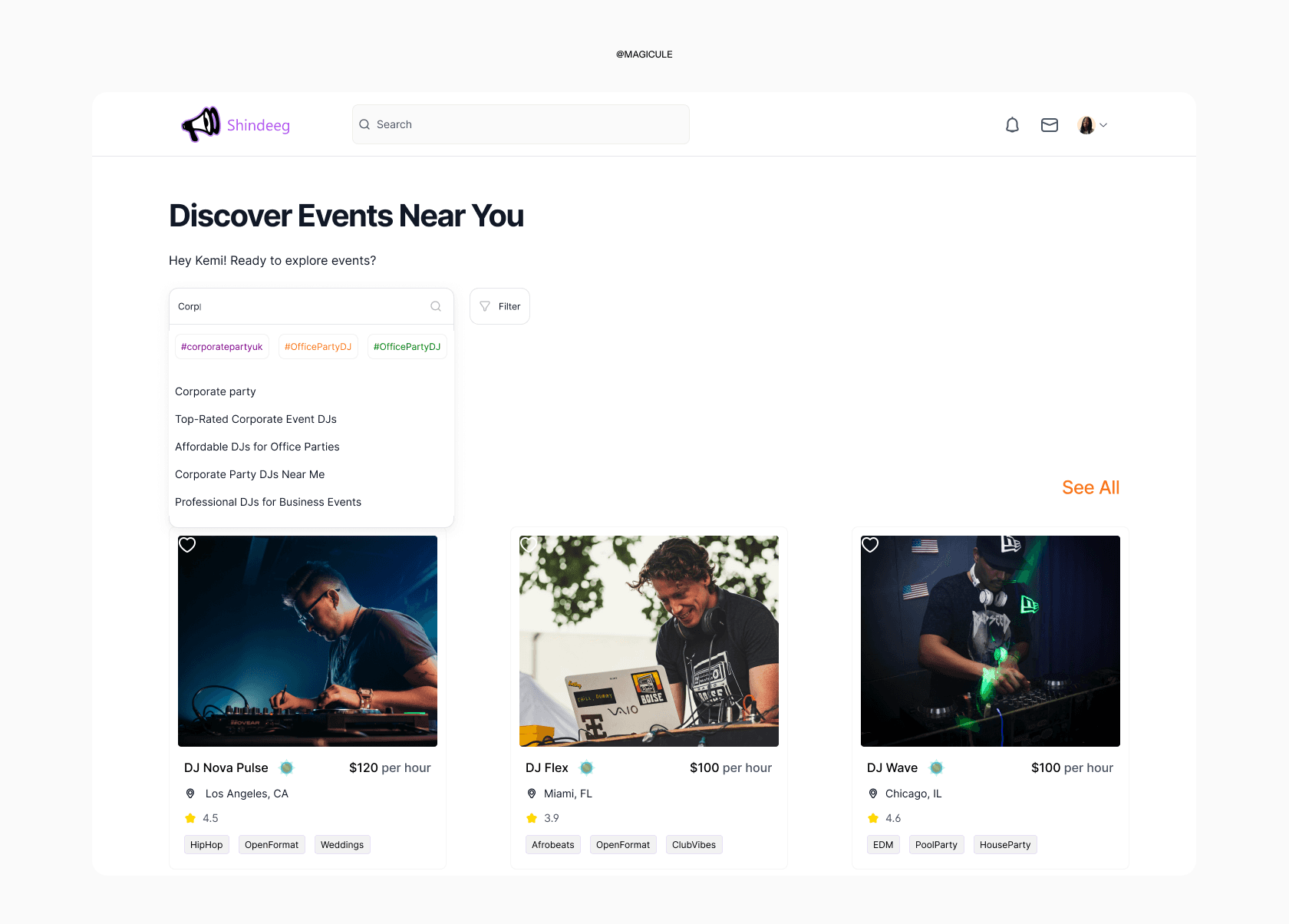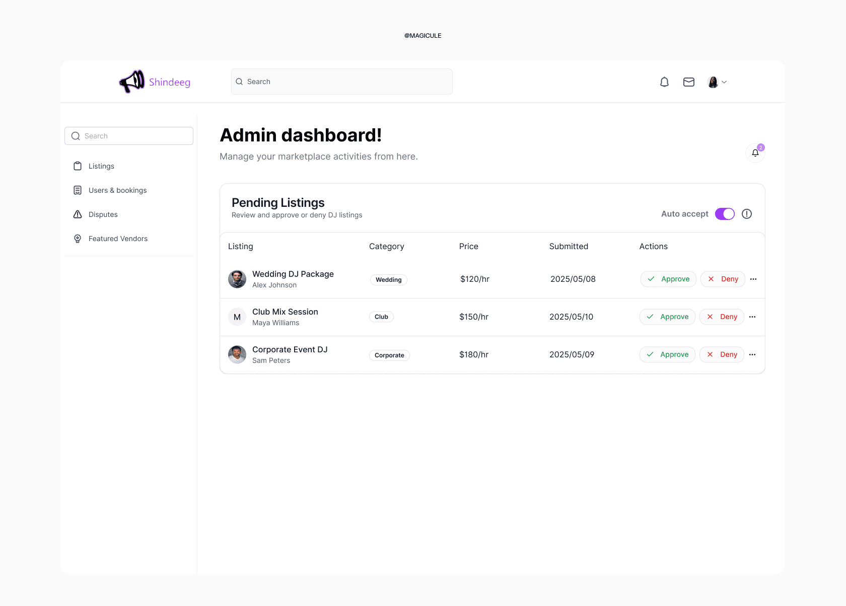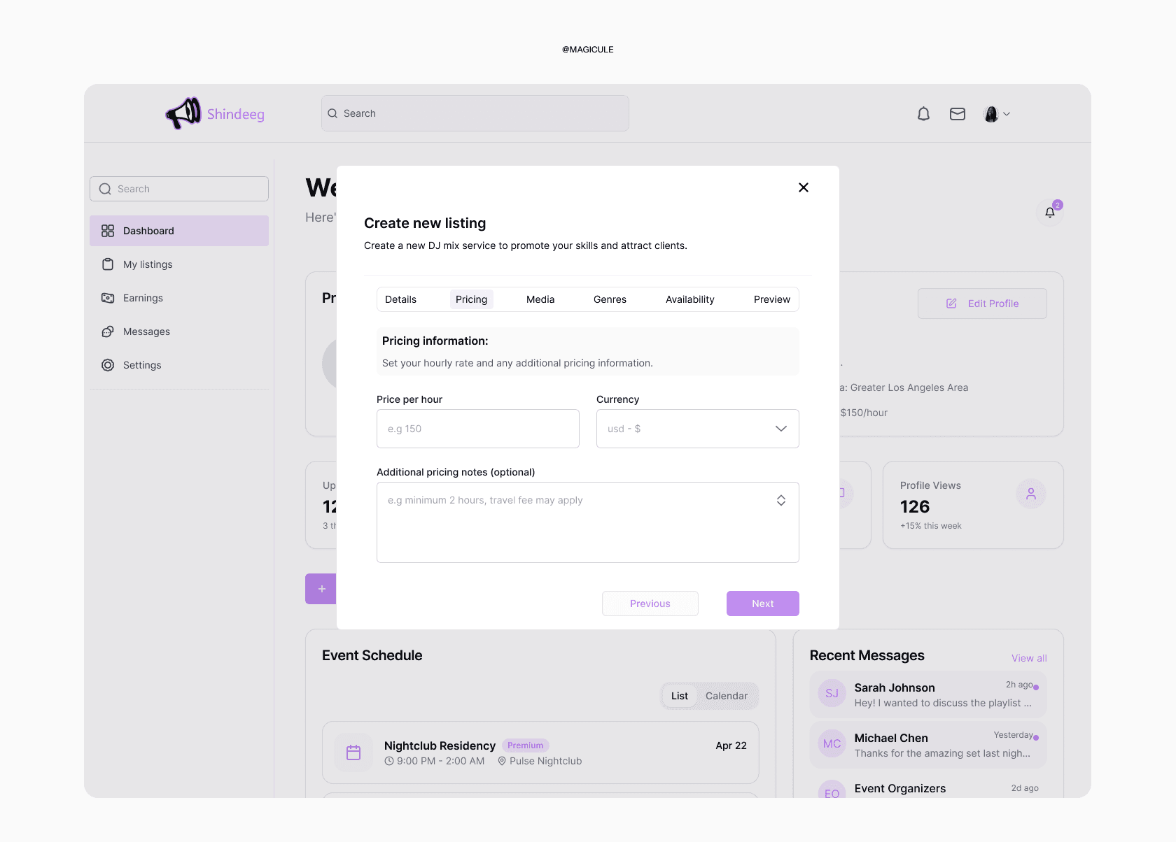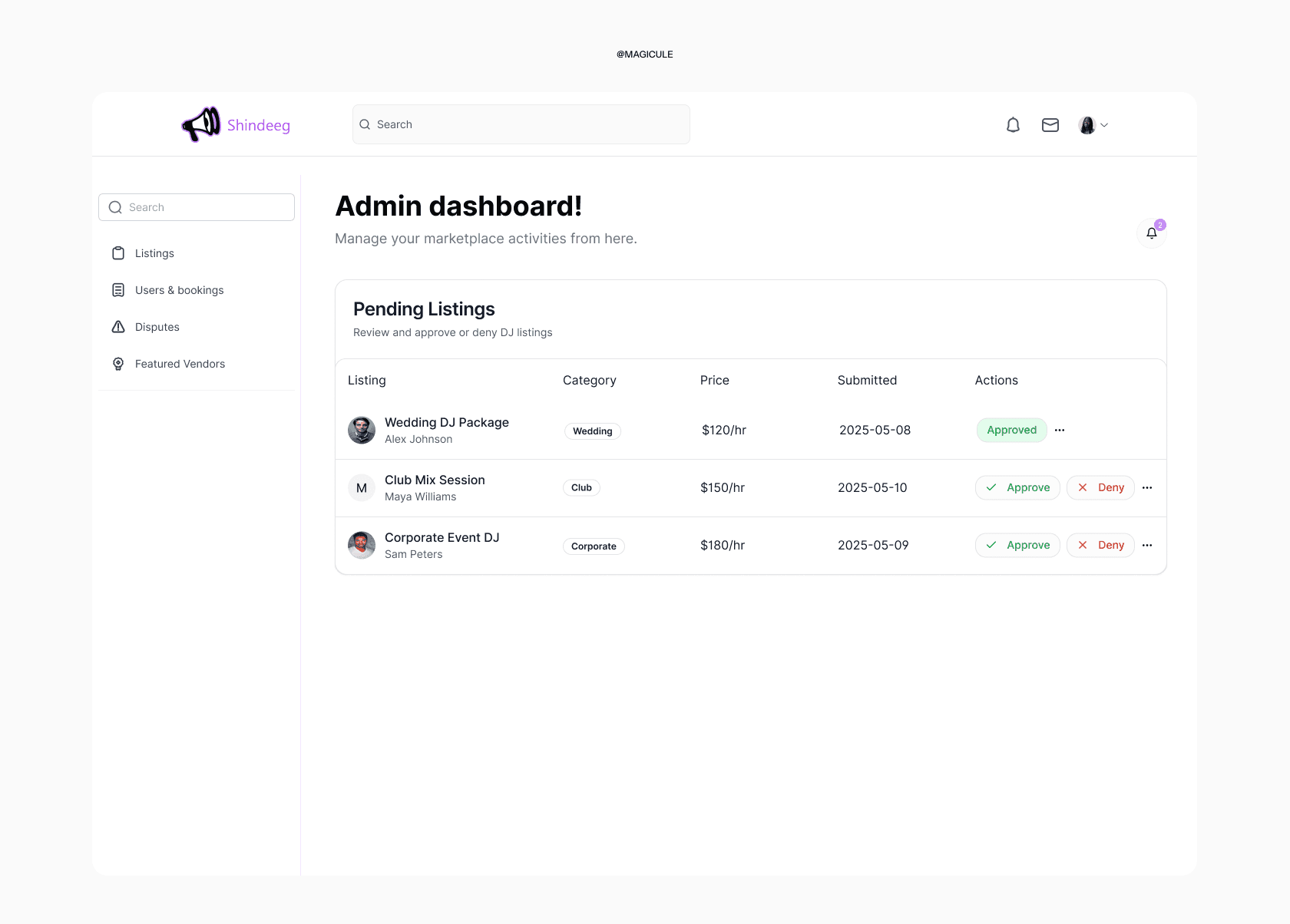 Shindeeg is a specialized marketplace designed to connect the key players in the live events and entertainment sector: DJs (Service Providers), Event Promoters (Venue/Event Organizers), and Party Goers and also people who wants to hire Djs (Customers). The platform's goal is to simplify the discovery, booking, and management of live music and events.