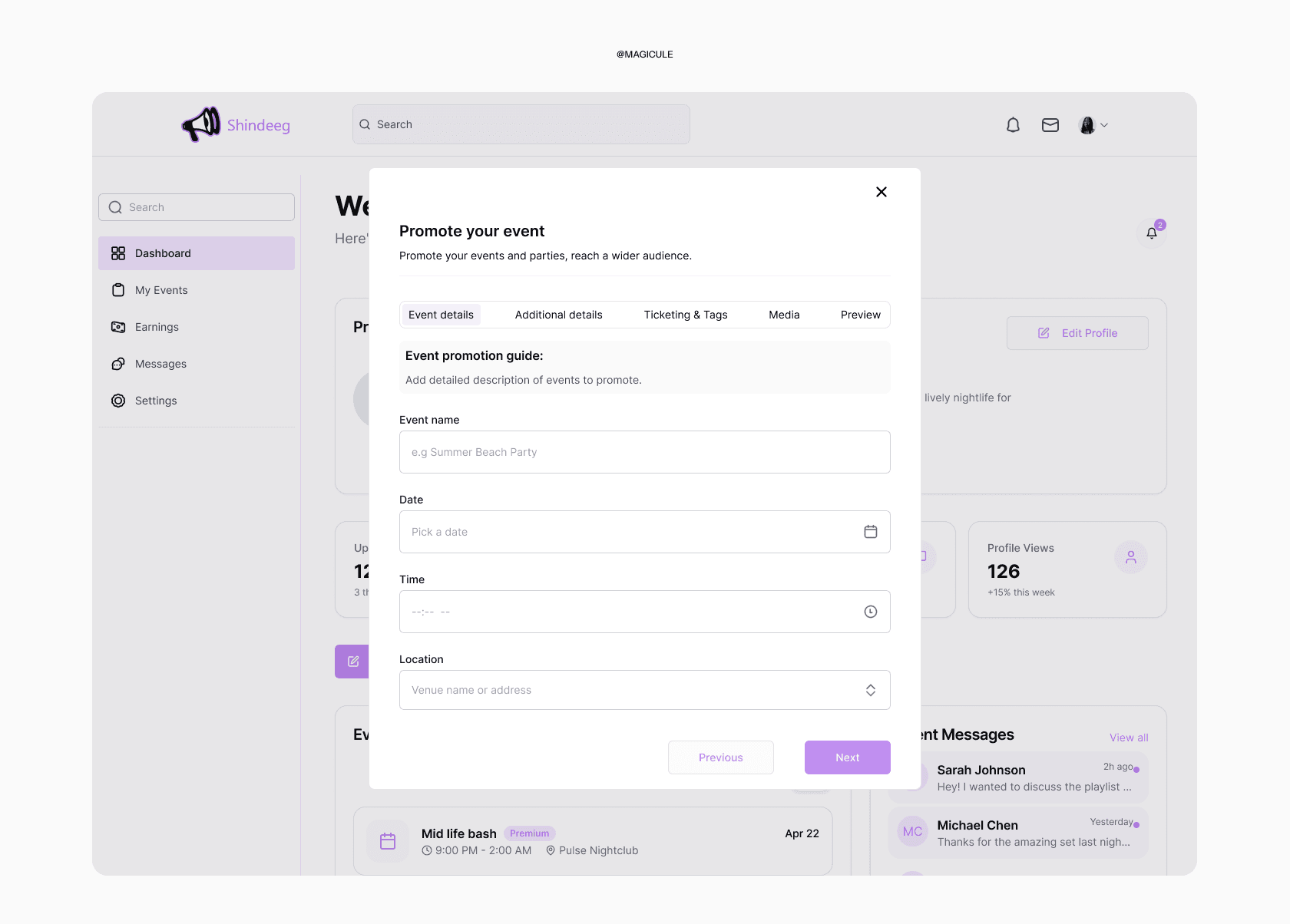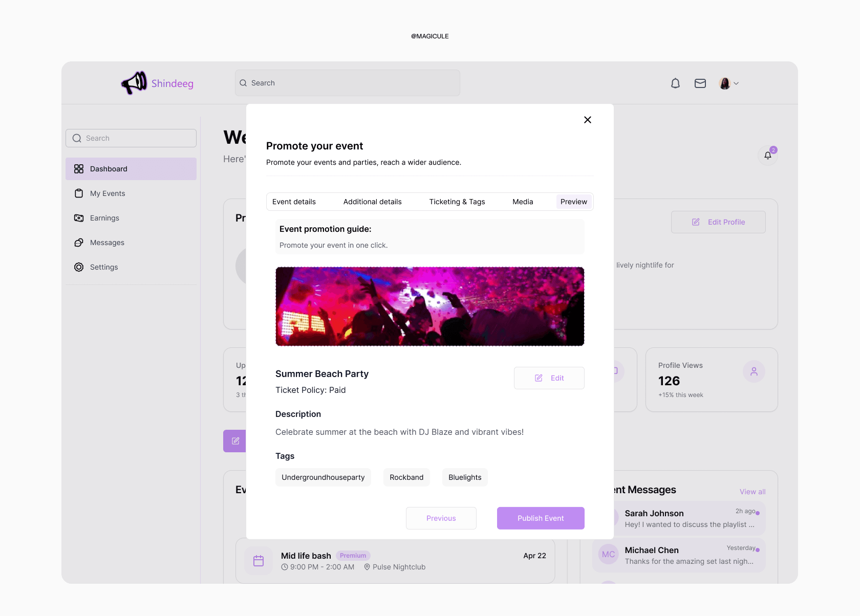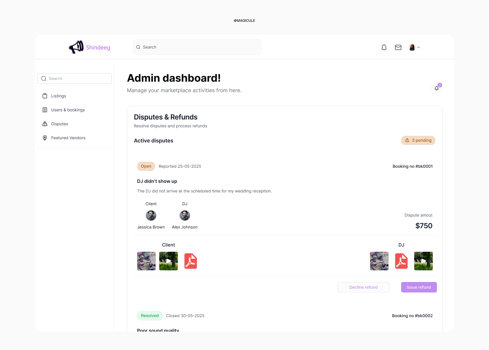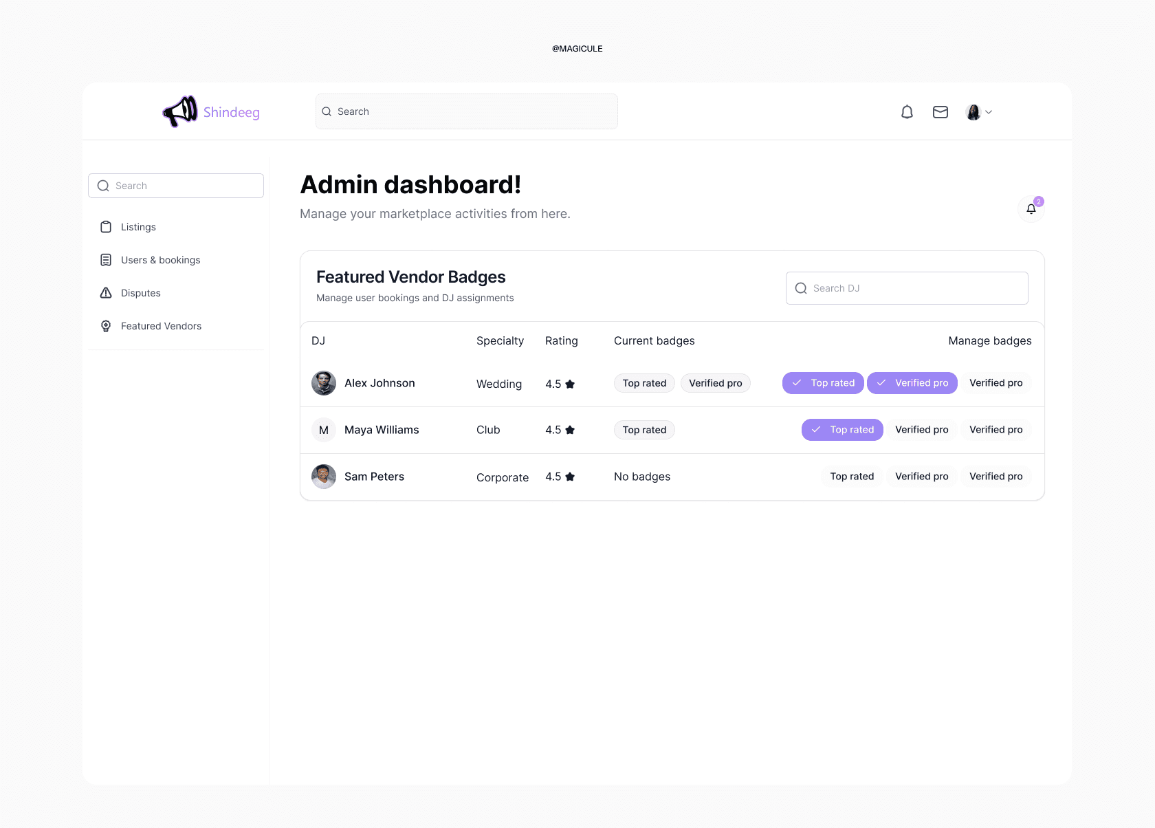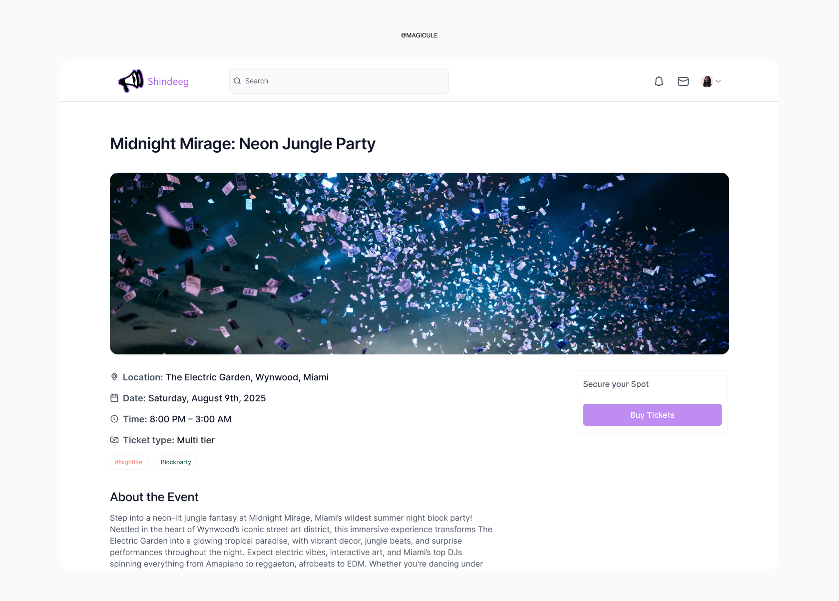 Shindeeg is a specialized marketplace designed to connect the key players in the live events and entertainment sector: DJs (Service Providers), Event Promoters (Venue/Event Organizers), and Party Goers and also people who wants to hire Djs (Customers). The platform's goal is to simplify the discovery, booking, and management of live music and events.