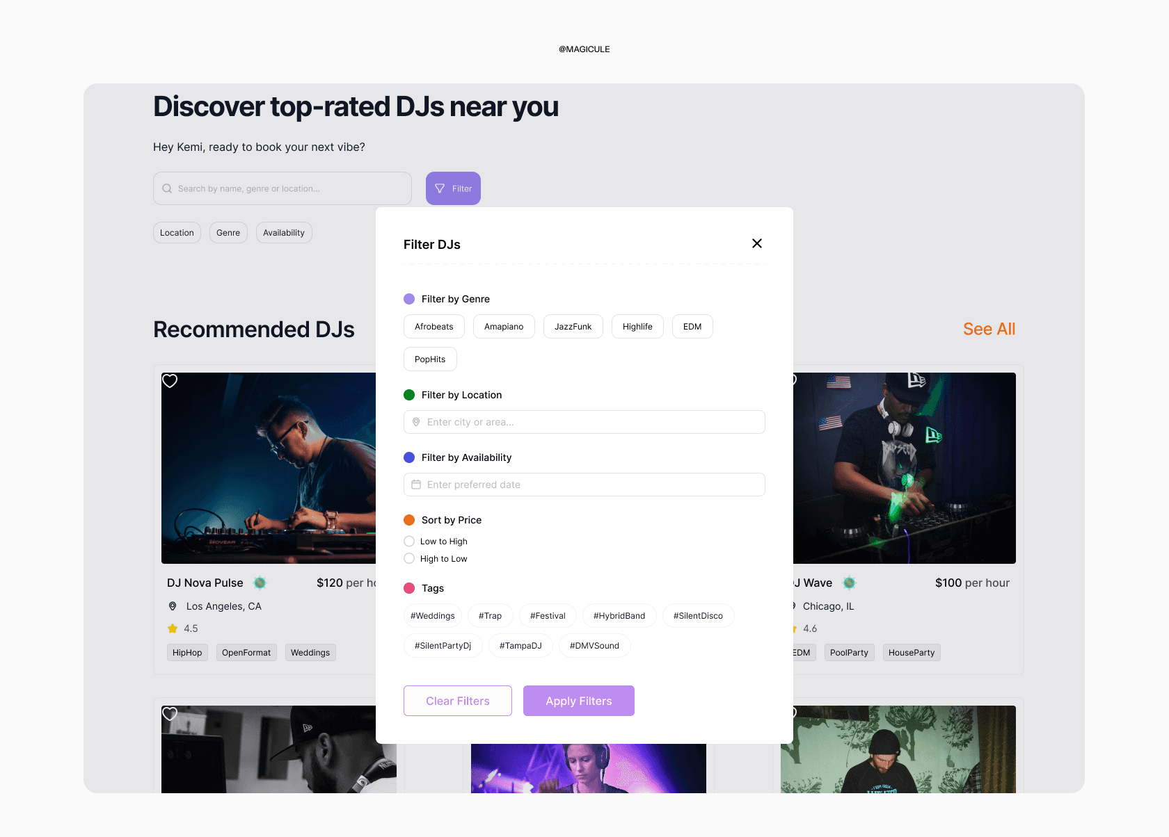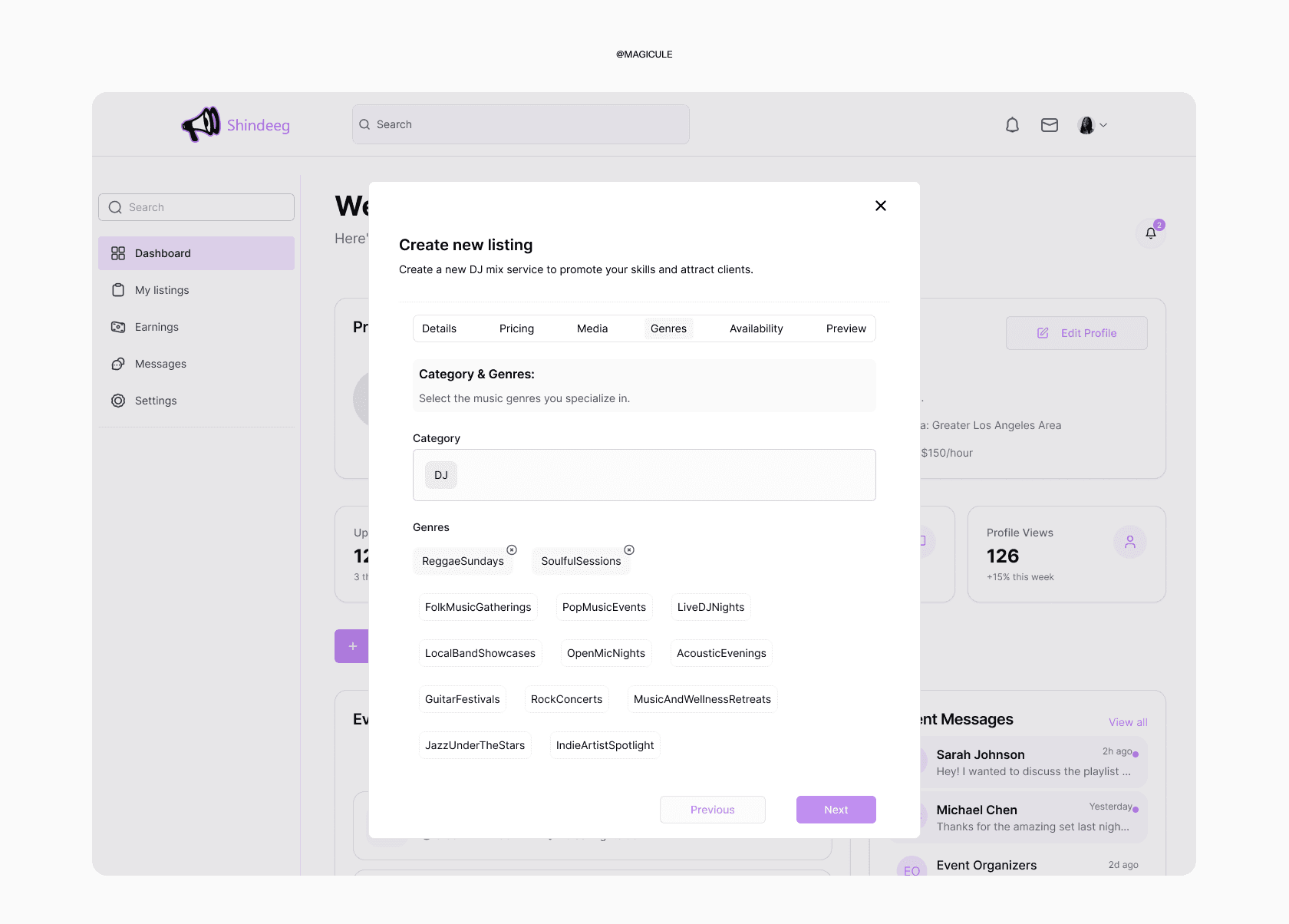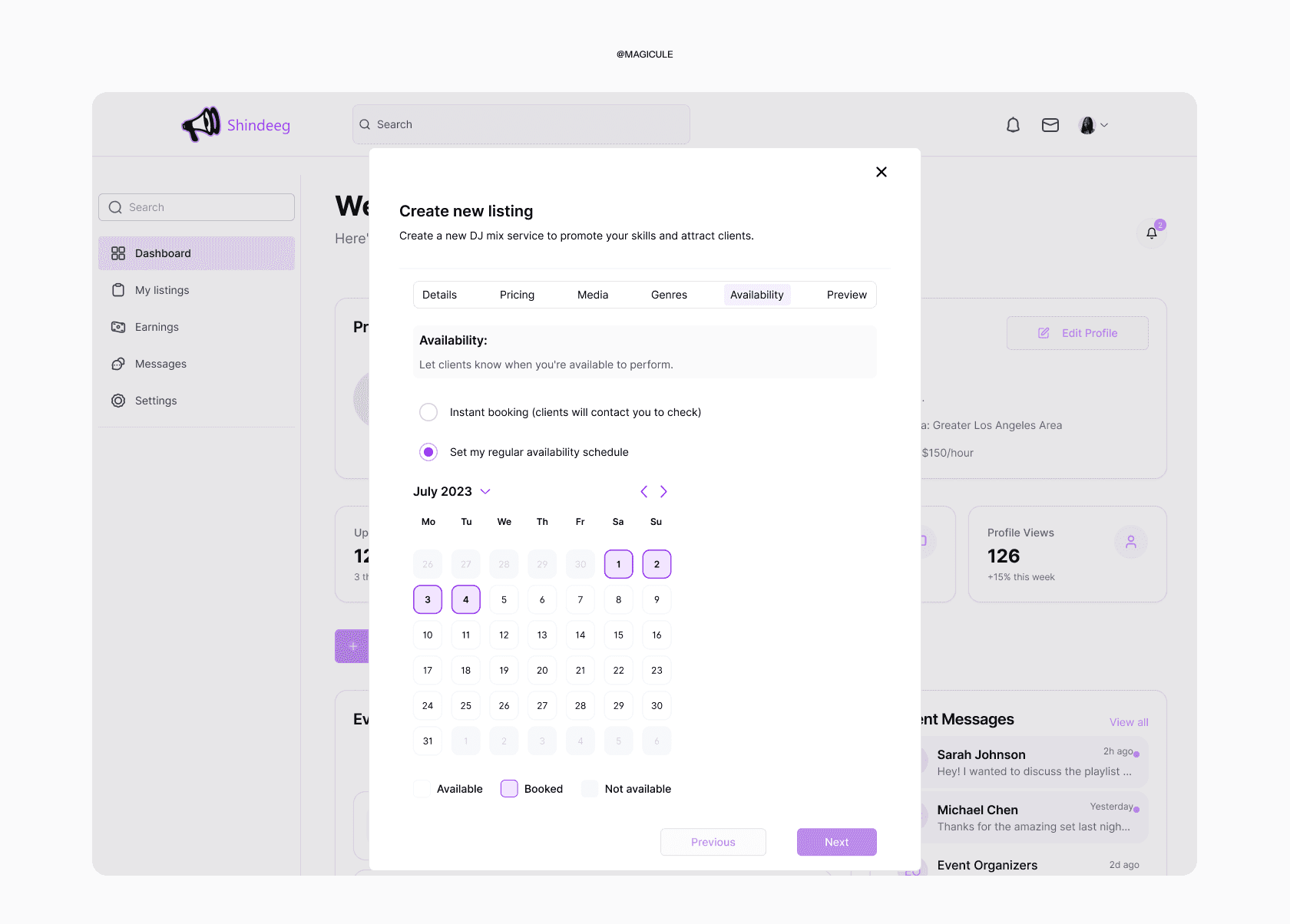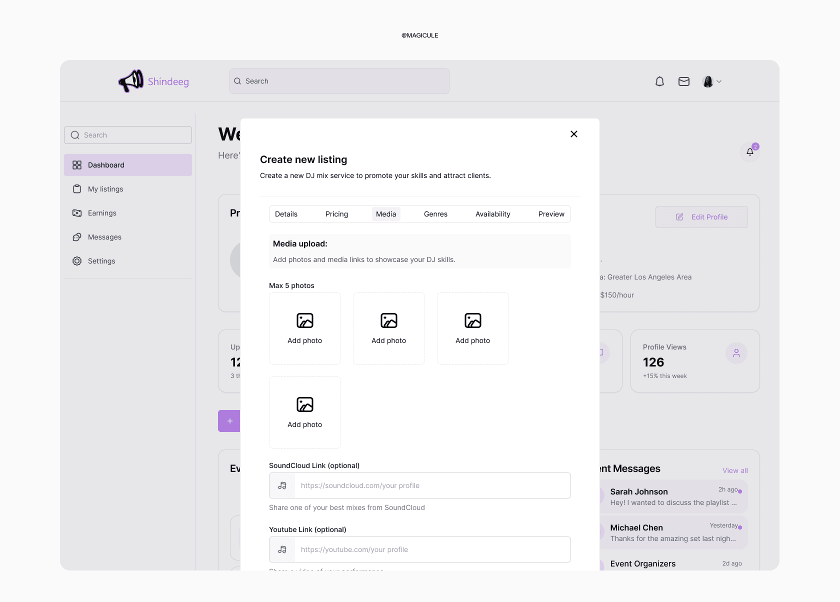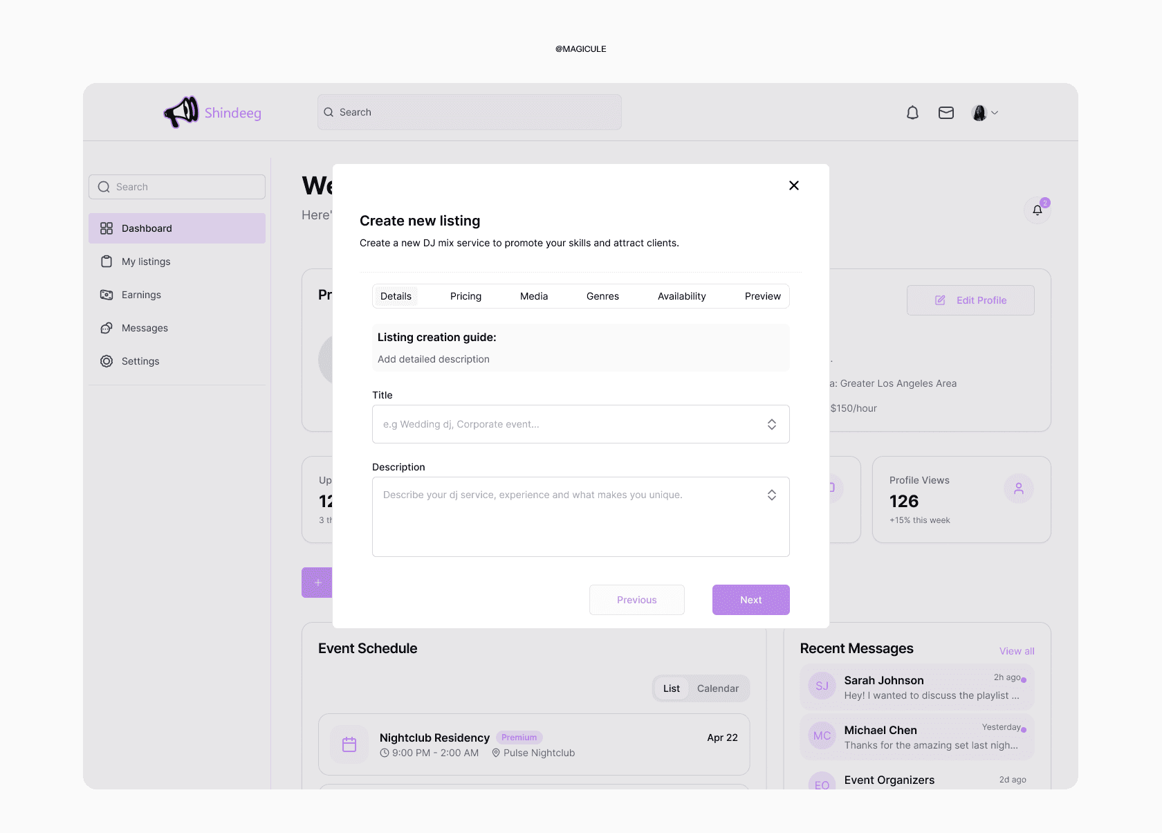 DJ Listing Wizard: Focused on capturing essential service data: music genre tagging, hourly rate, media uploads (mixes), and setting up the Availability Calendar. The process was streamlined to ensure rapid profile completion.