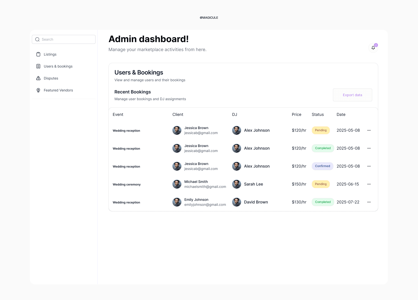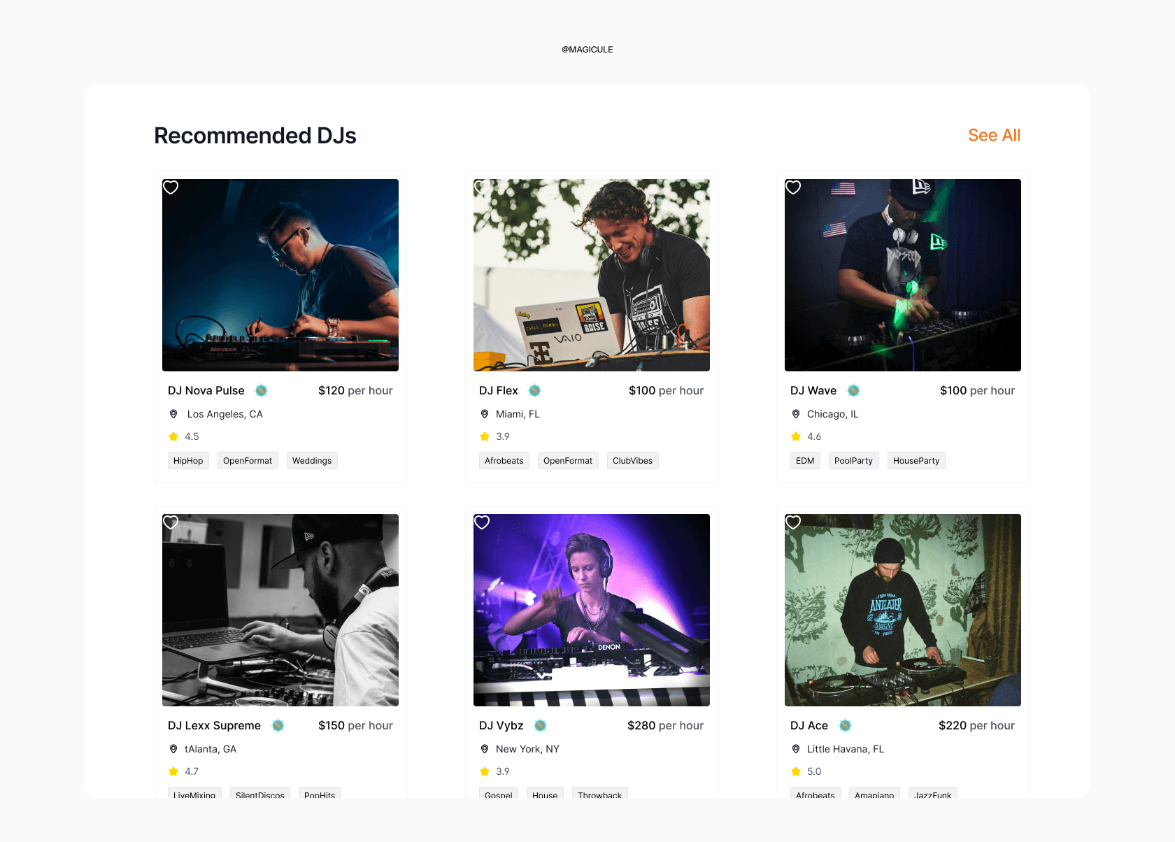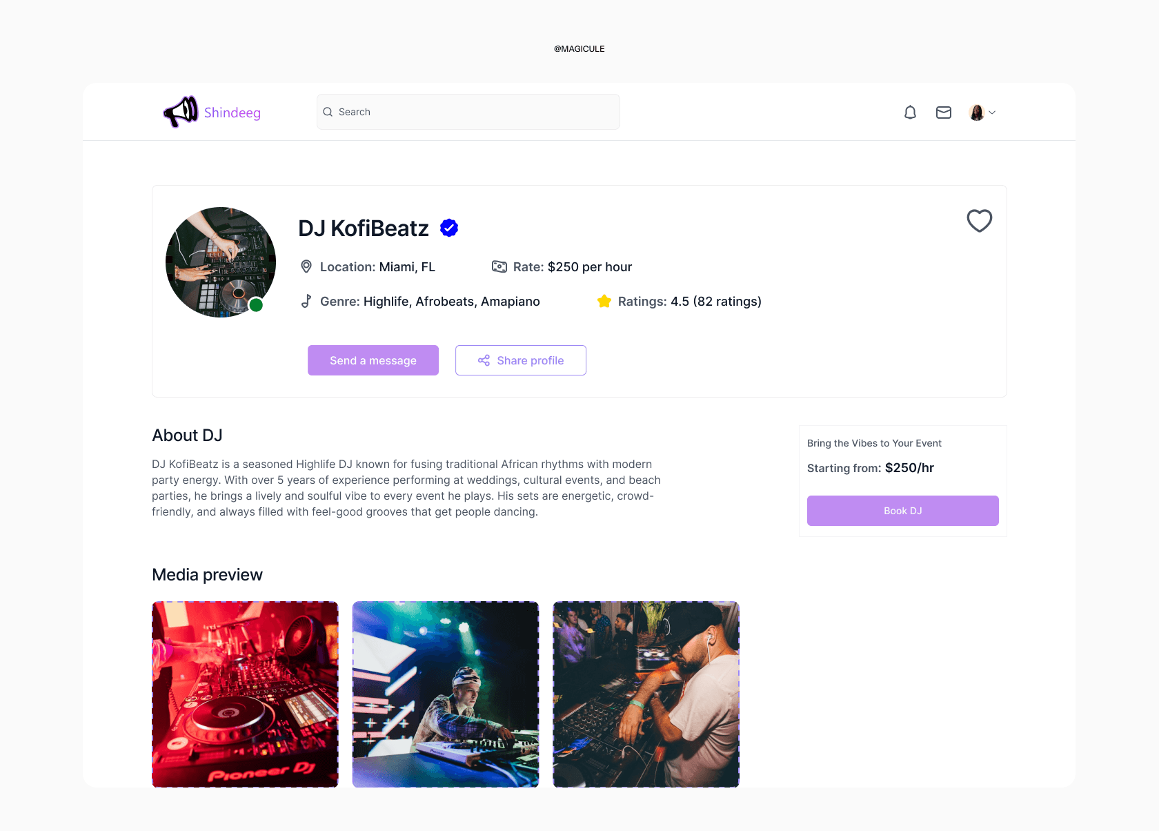 DJ's Portfolio Presentation: DJs need dedicated tools to showcase their brand, music samples, and most importantly, an intuitive way to manage their availability and receive accurate gig details.
