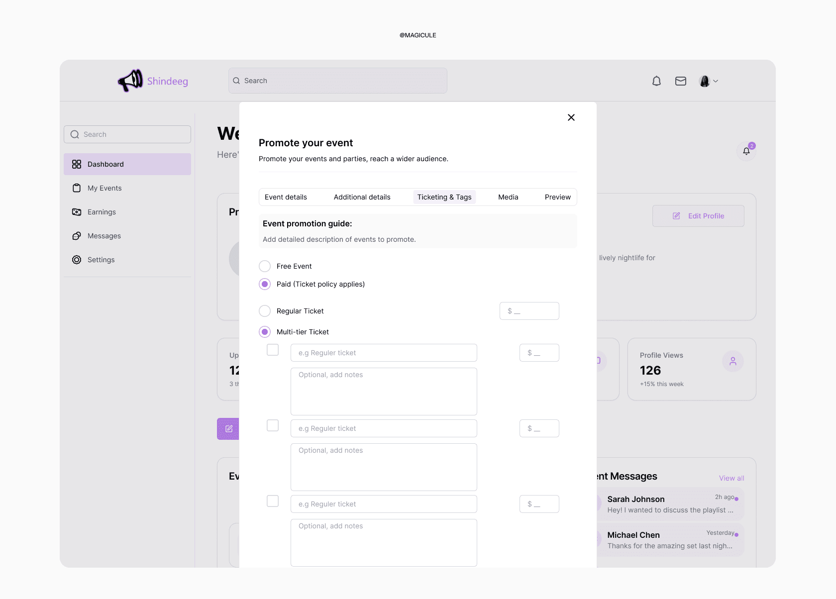 Promoter Event Wizard: Focused on transactional data: Venue details, ticket tiers, capacity limits, and integration with the DJ hiring flow (e.g., requesting bids from pre-vetted DJs).